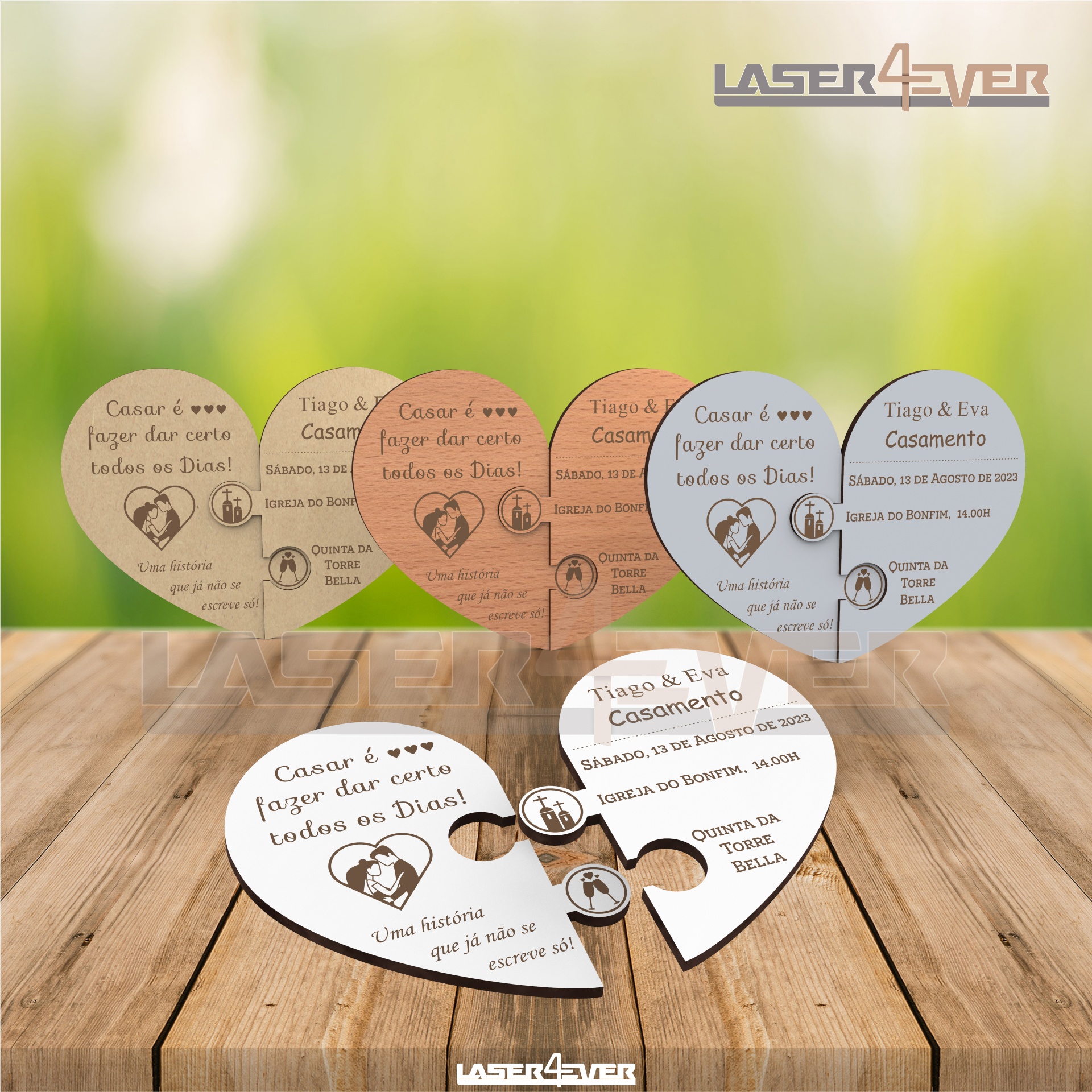 Convite de Casamento em forma de coração, composto por duas peças que se encaixam como um puzzle. Convite personalizável feito em Madeira MDF.