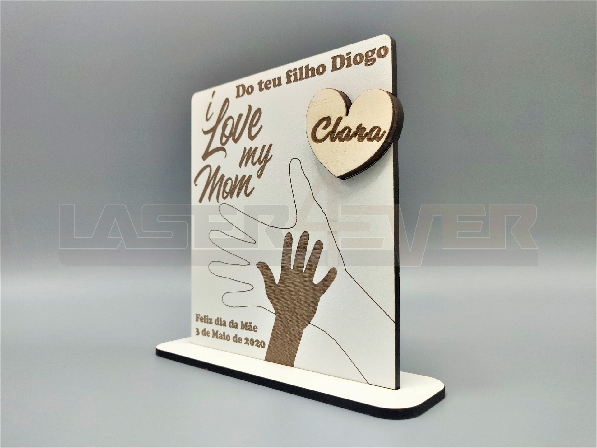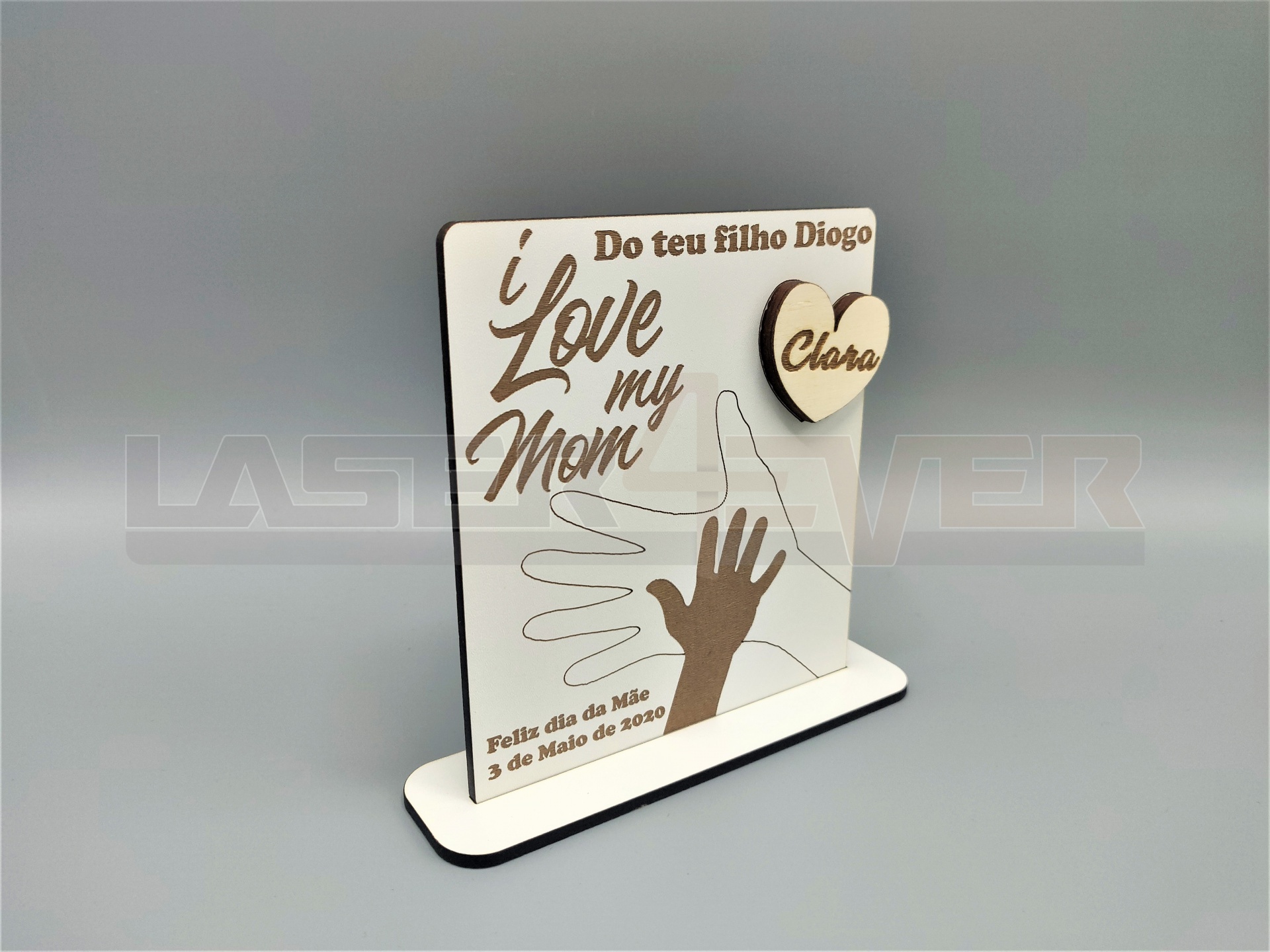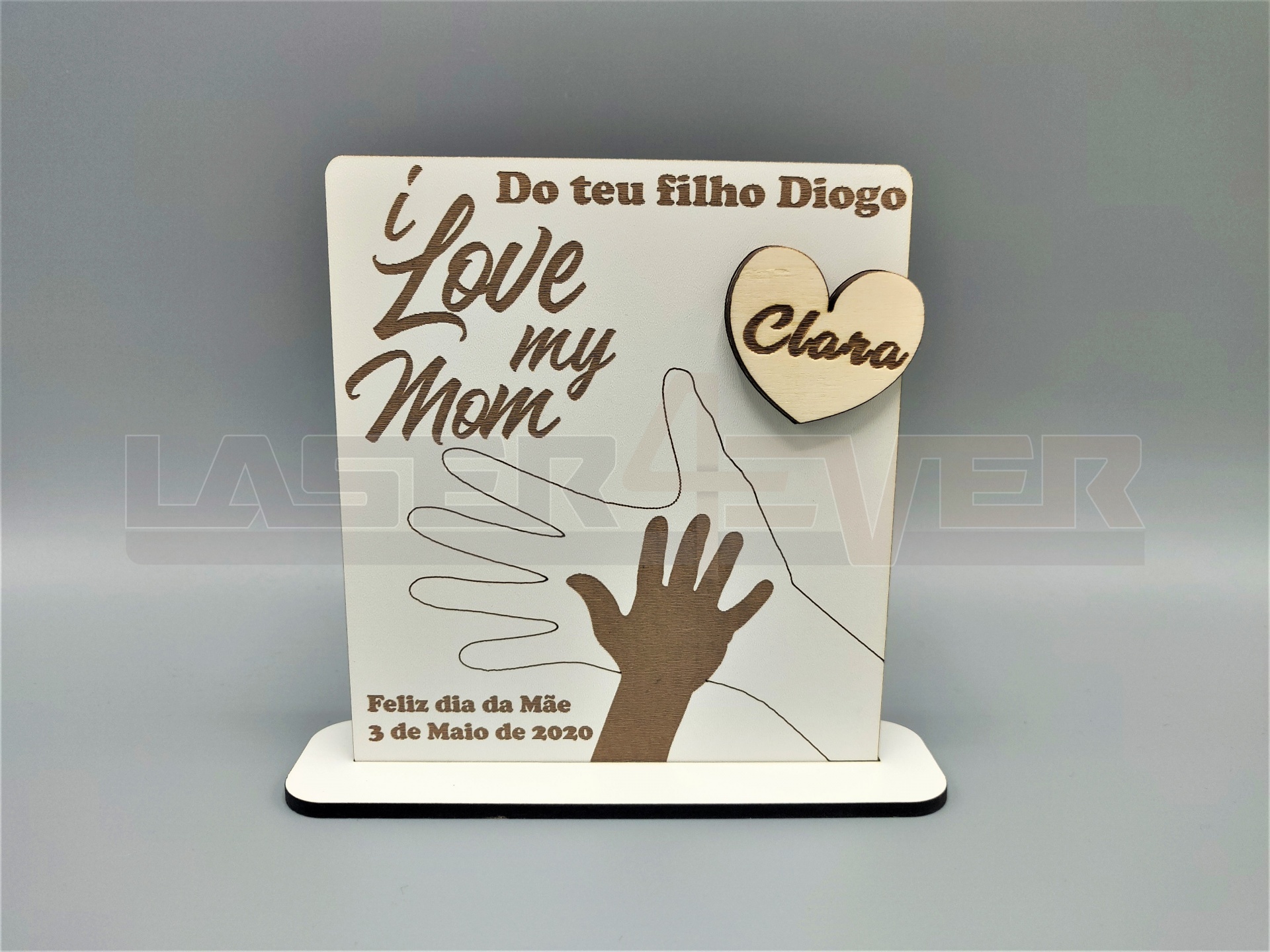 Placa "I Love MY MOM", em madeira e com nomes e data personalizáveis.