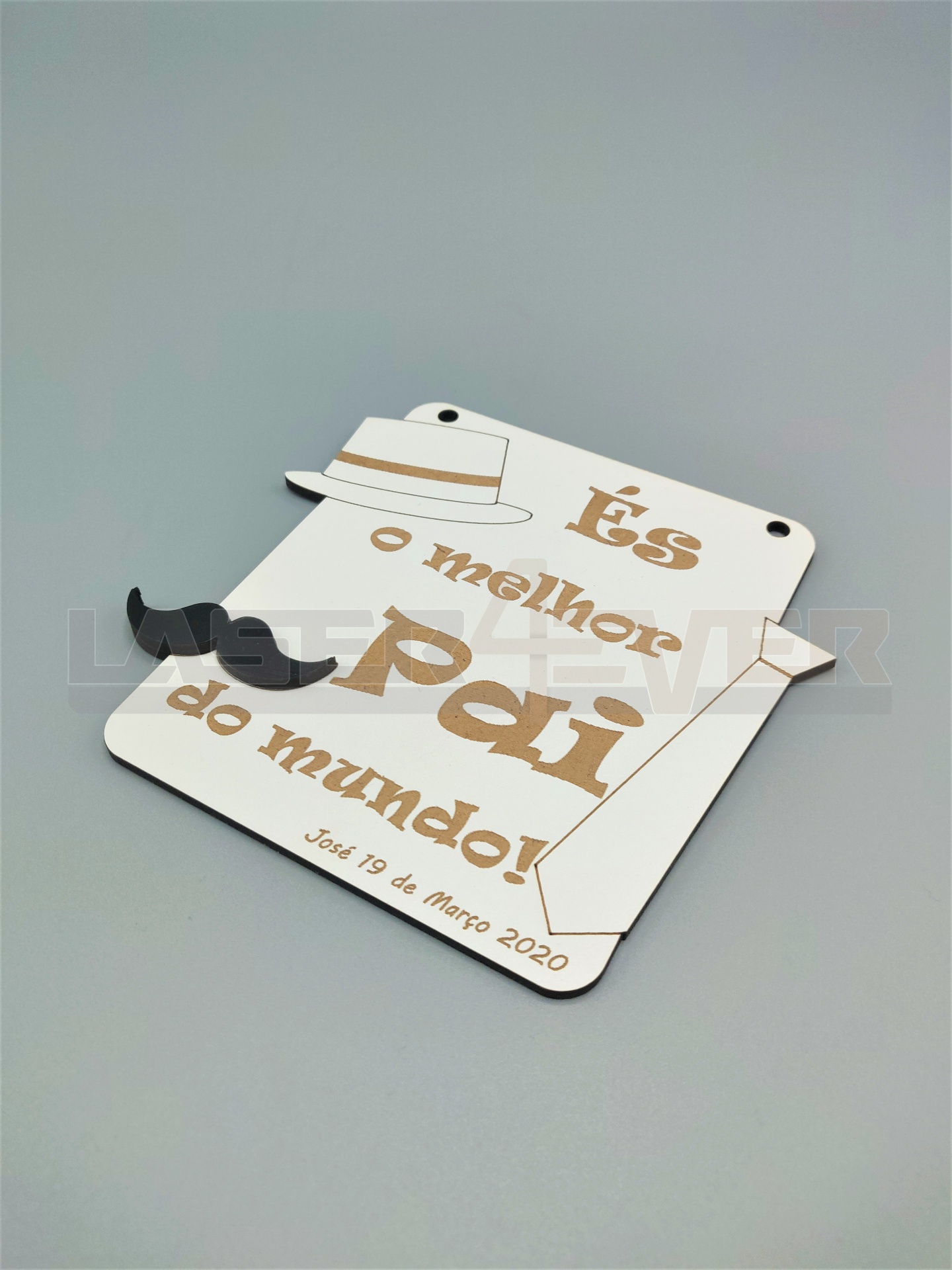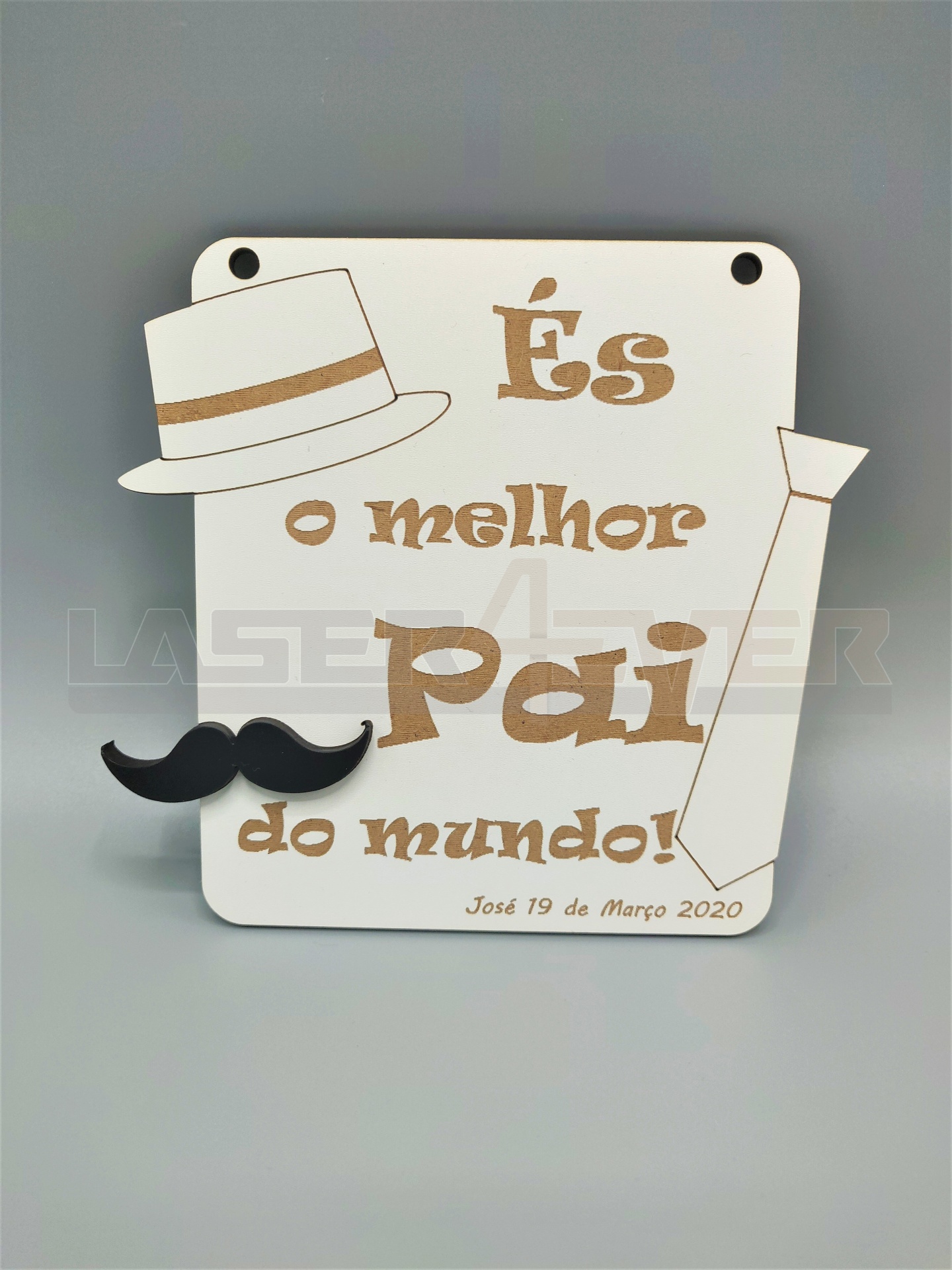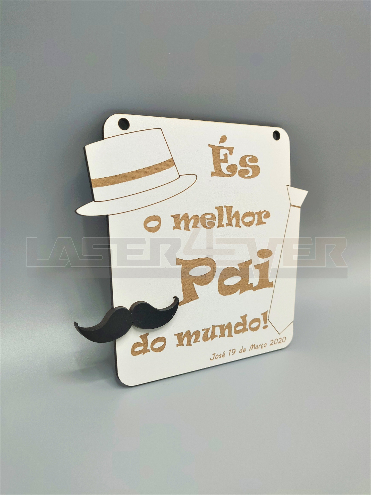 Placa em madeira com a gravação "És o Melhor Pai do Mundo", com nome e data personaliáveis.