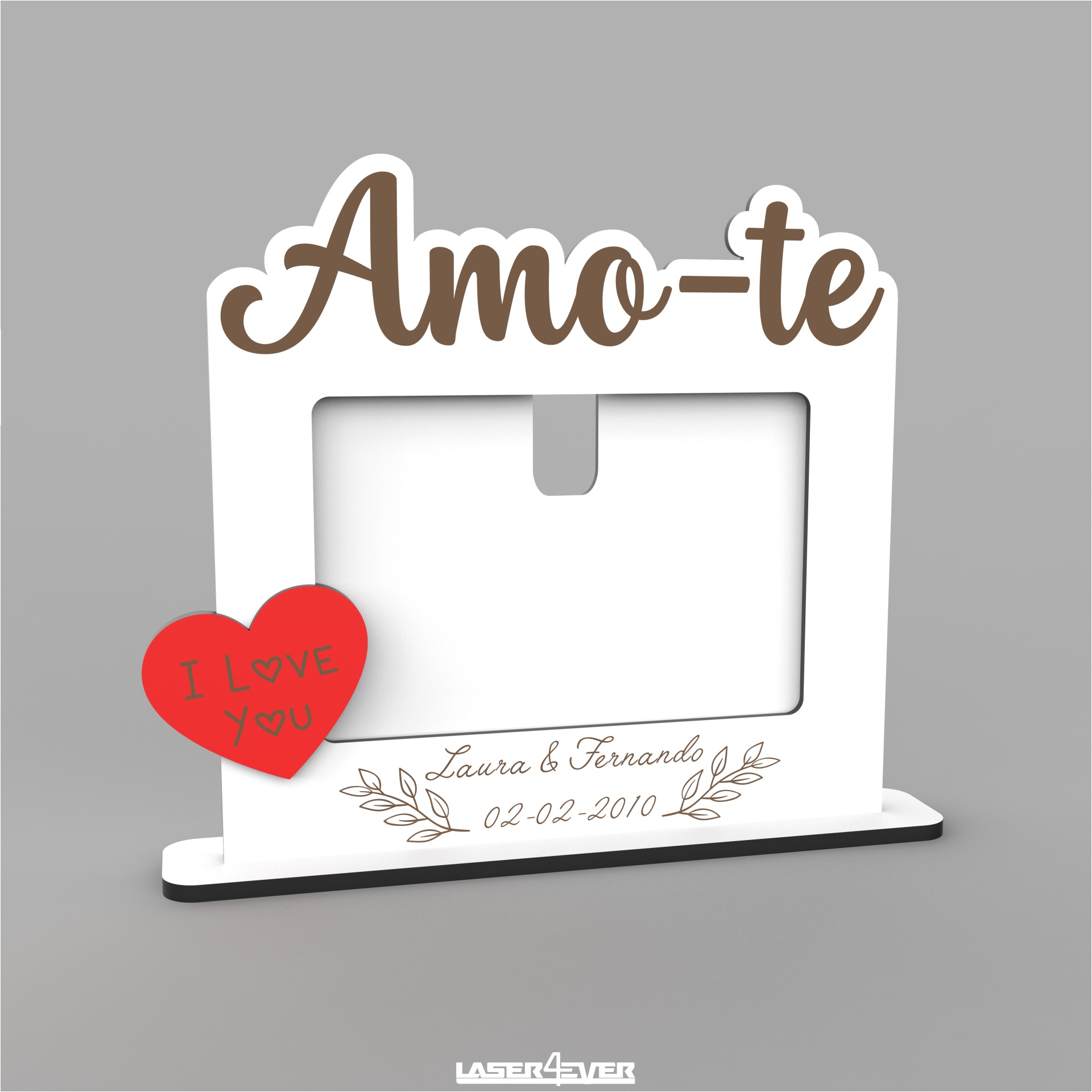 Moldura com a mensagem "Amo-te" com nome e data personalizados, produto feito em madeira. Aplique coração em vermelho com a mensagem "I Love You".