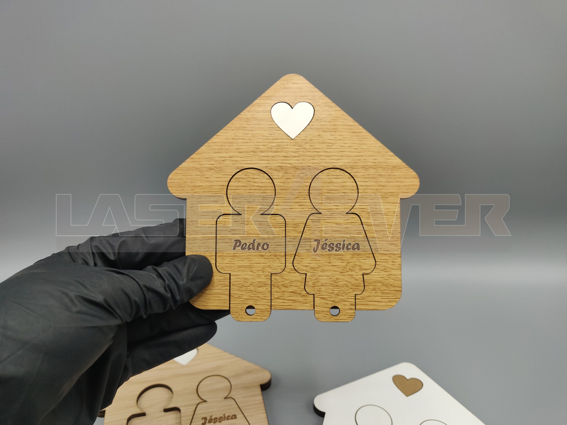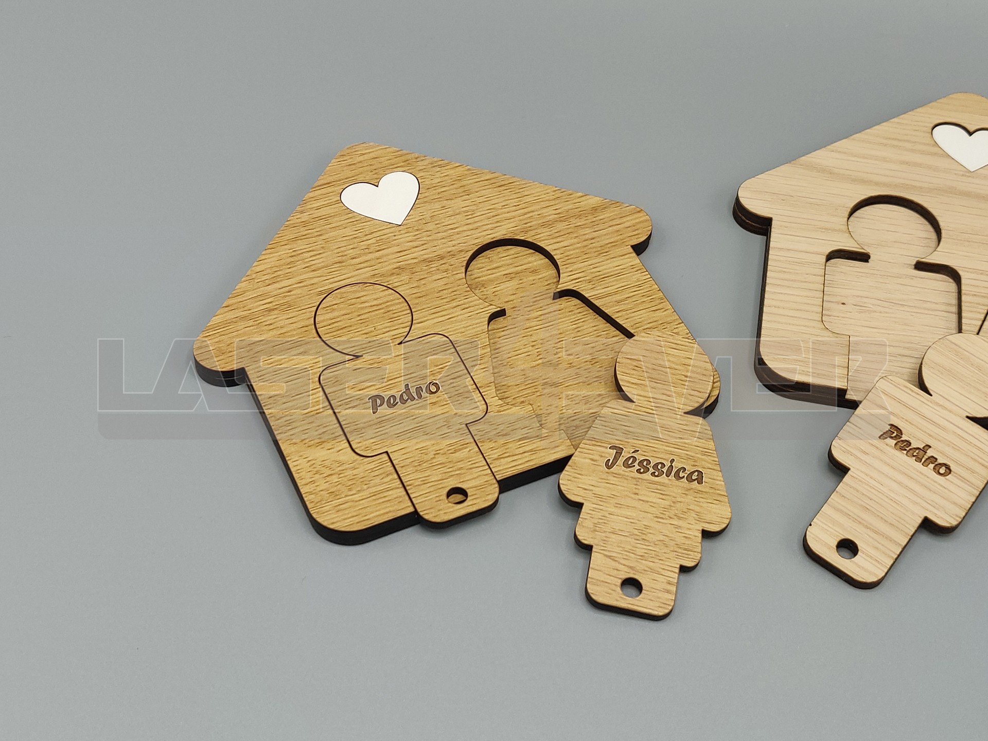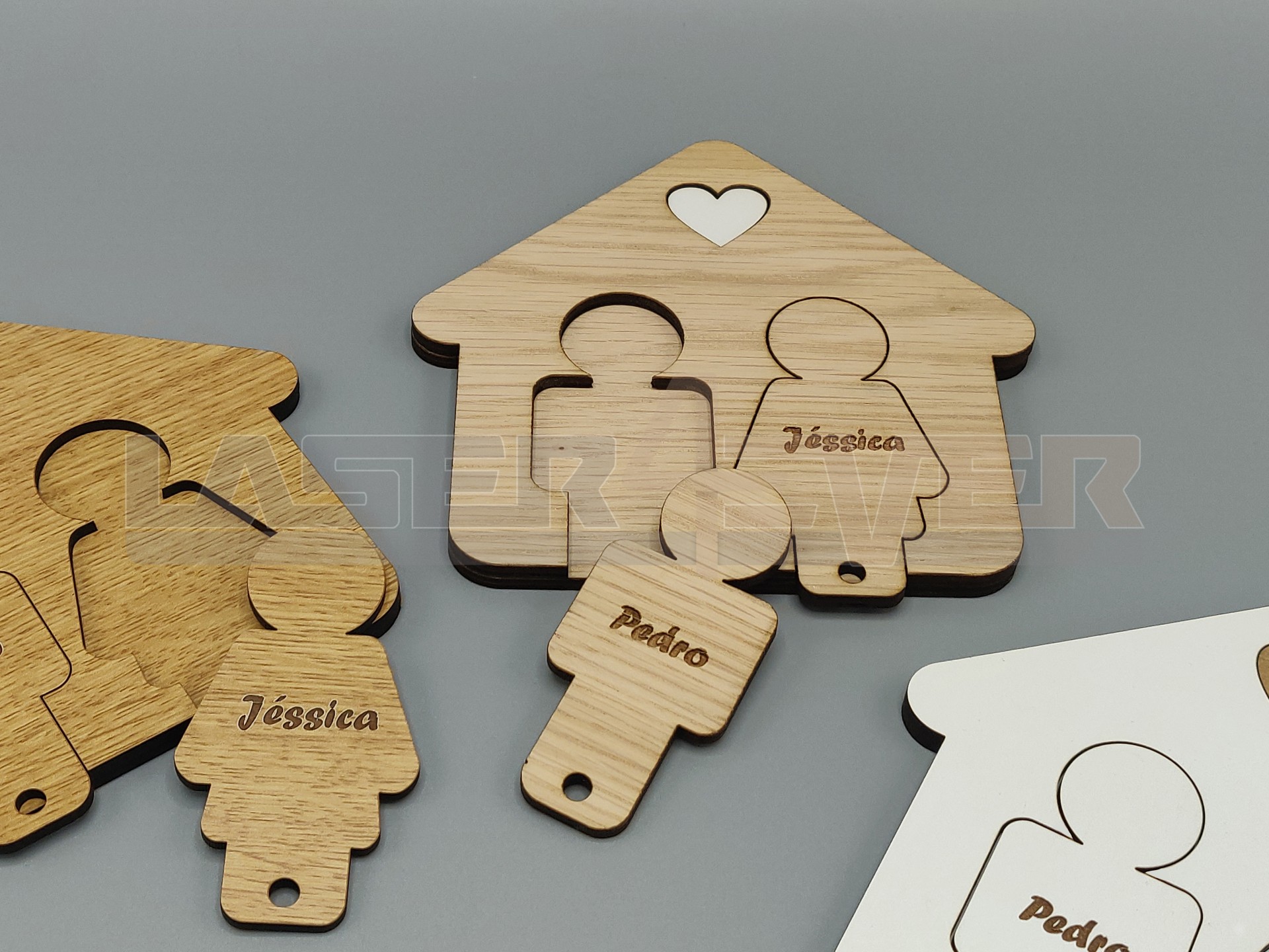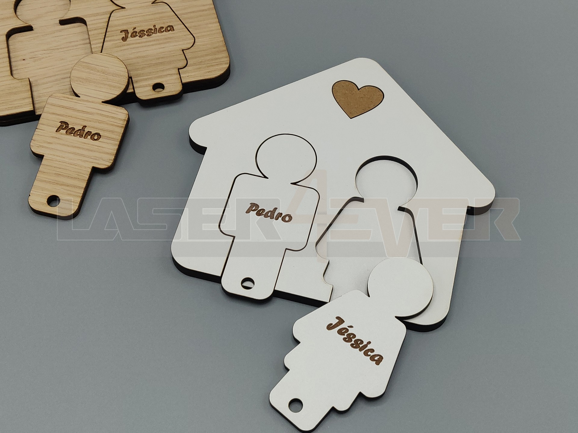 Chaveiro com nome personalizado e com ilustração de homem e mulher para 2 pares de chaves. Um óptimo artigo para casais. Dispnível em madeira MDF Branco, MDf tom de carvalho, Contraplacado tom de Carvalho.