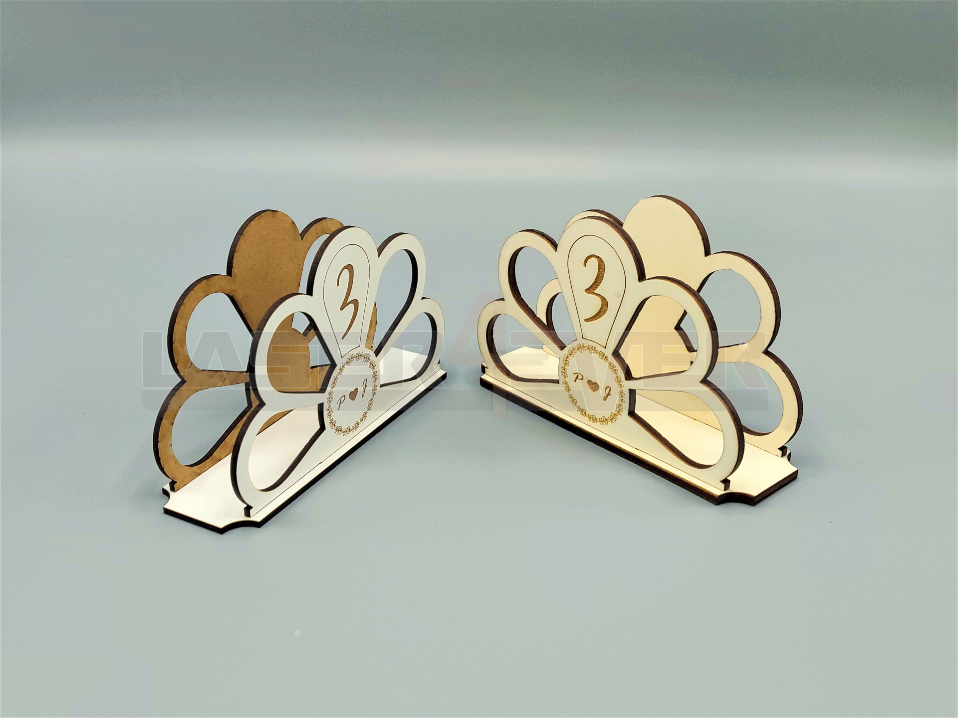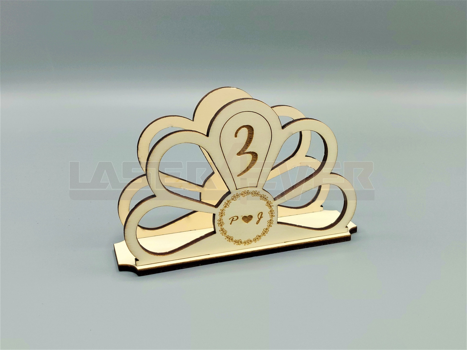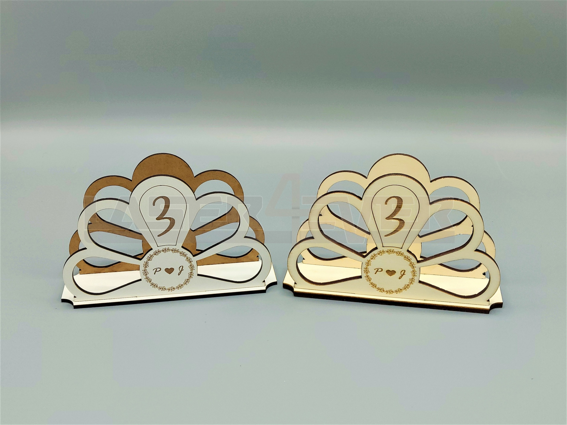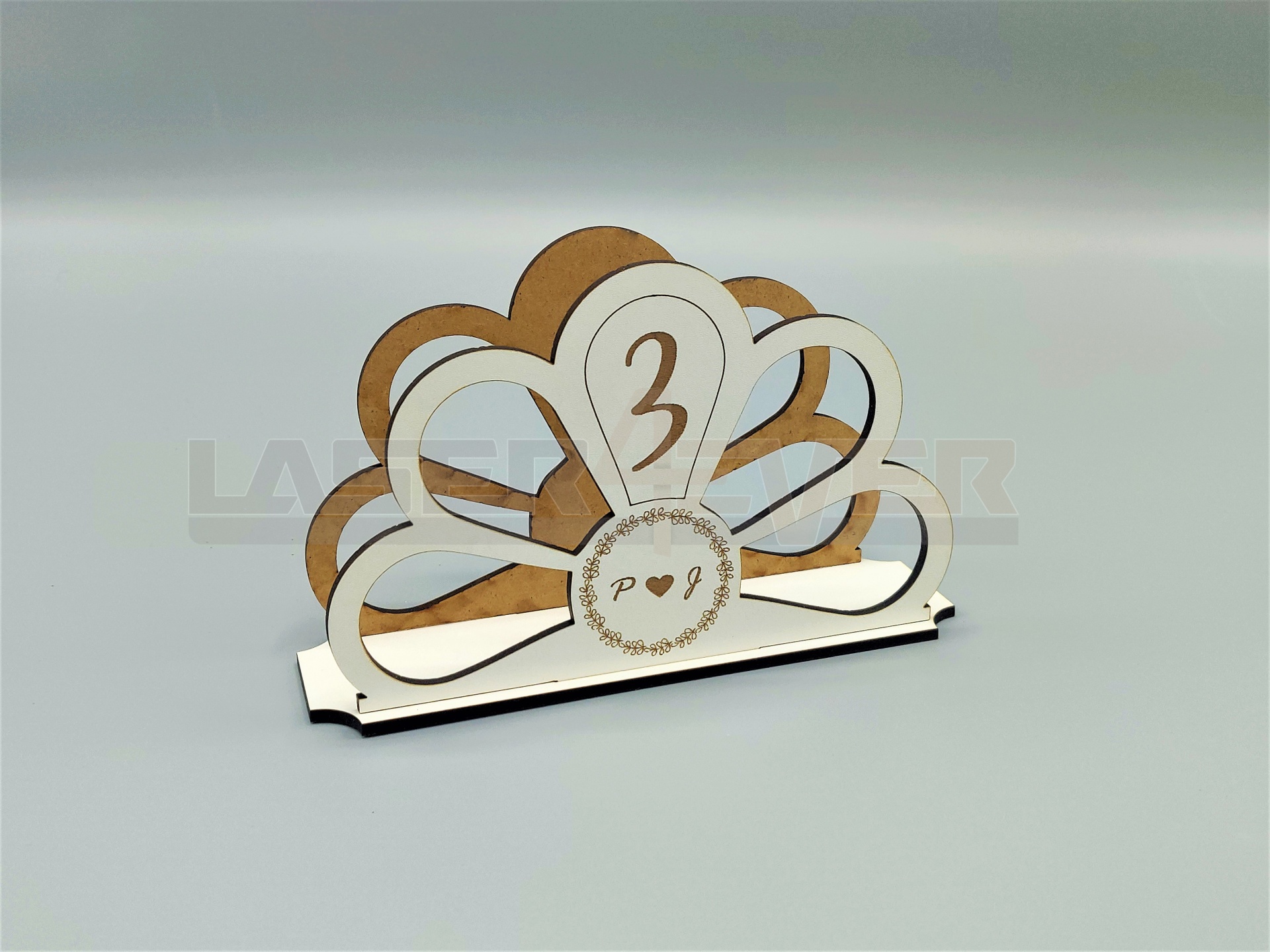 Marcador de Mesa para Casamentos. Artigo em madeira com números e inciais dos noivos personalizáveis.