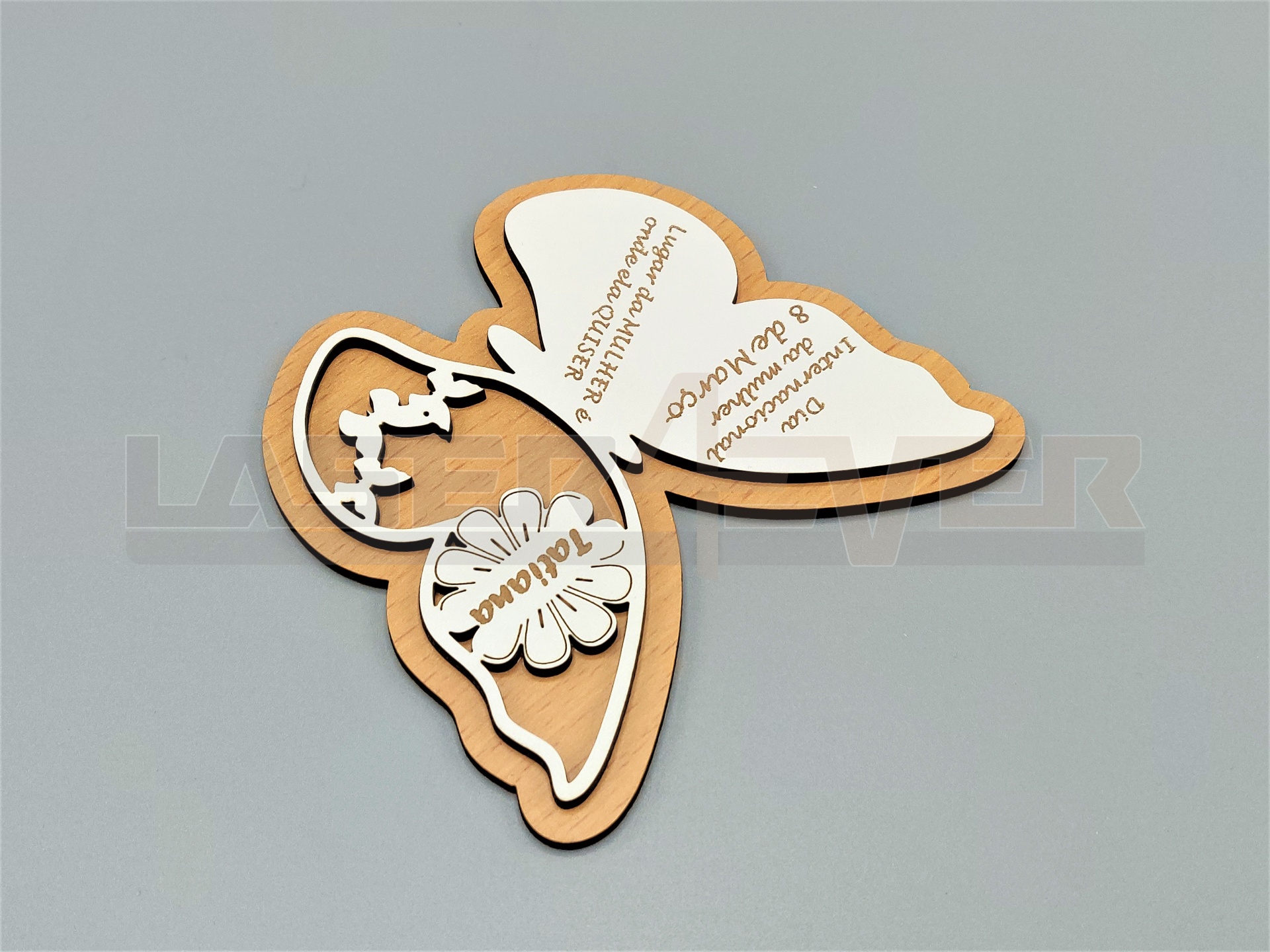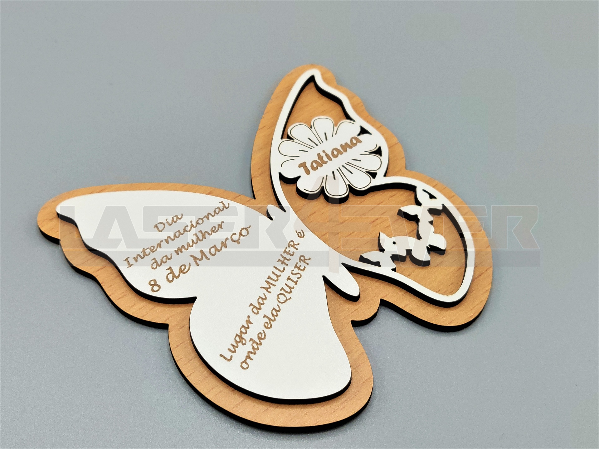 Prenda em forma de borboleta para oferecer no Dia Internacional da Mulher. Artigo com nome e mensagem personalizável em Madeira.
