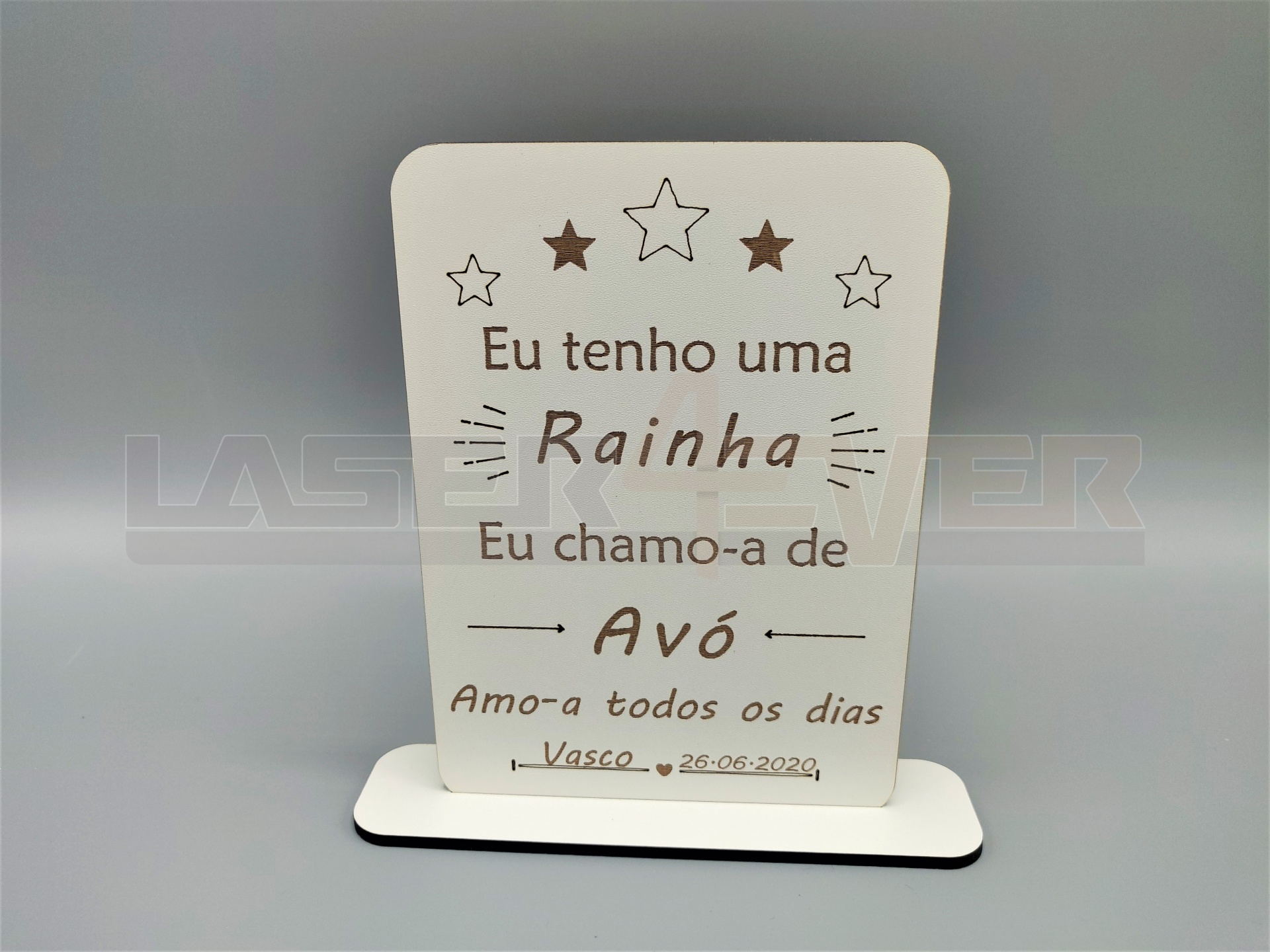 Placa "Eu tenho um Rei/Rainha", em madeira com nome e data personalizáveis.
